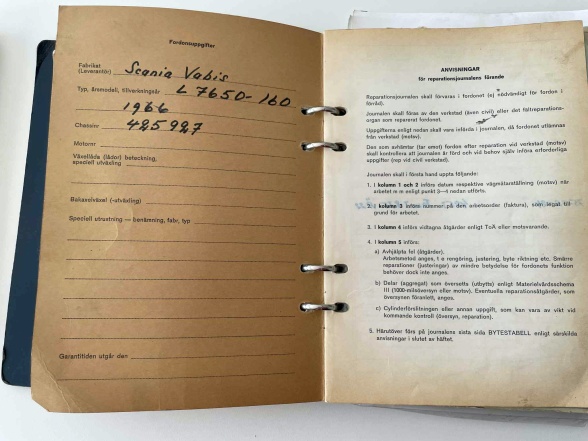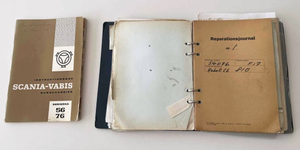 Instruktionsbok från Sacania-Vabis samt reparationsjournalen under flik 9 i kontrollboken.