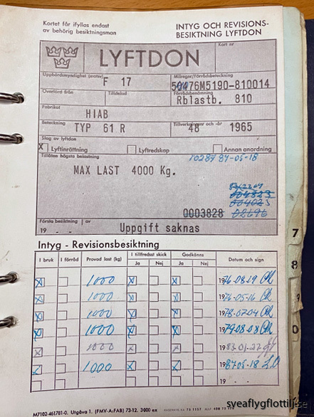 Flik 6 i kontrollboken. Besiktningsjournal för HIAB-kranen.