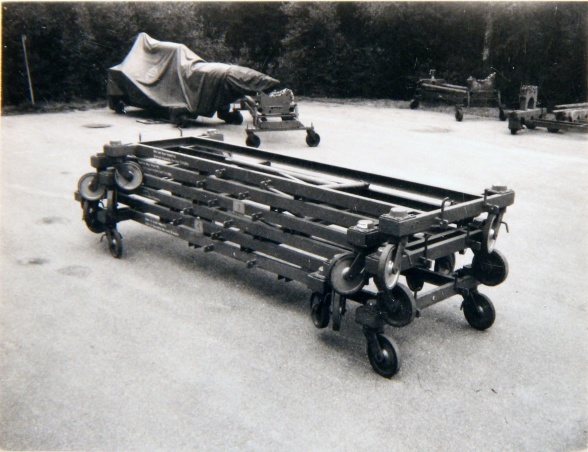 Här ser vi stativ och robotställ på ett robotsläp. Man ser även hur de är sammankopplade med öglor och krokar.