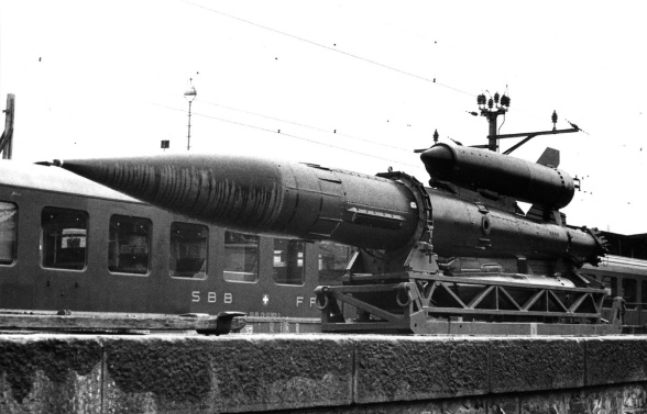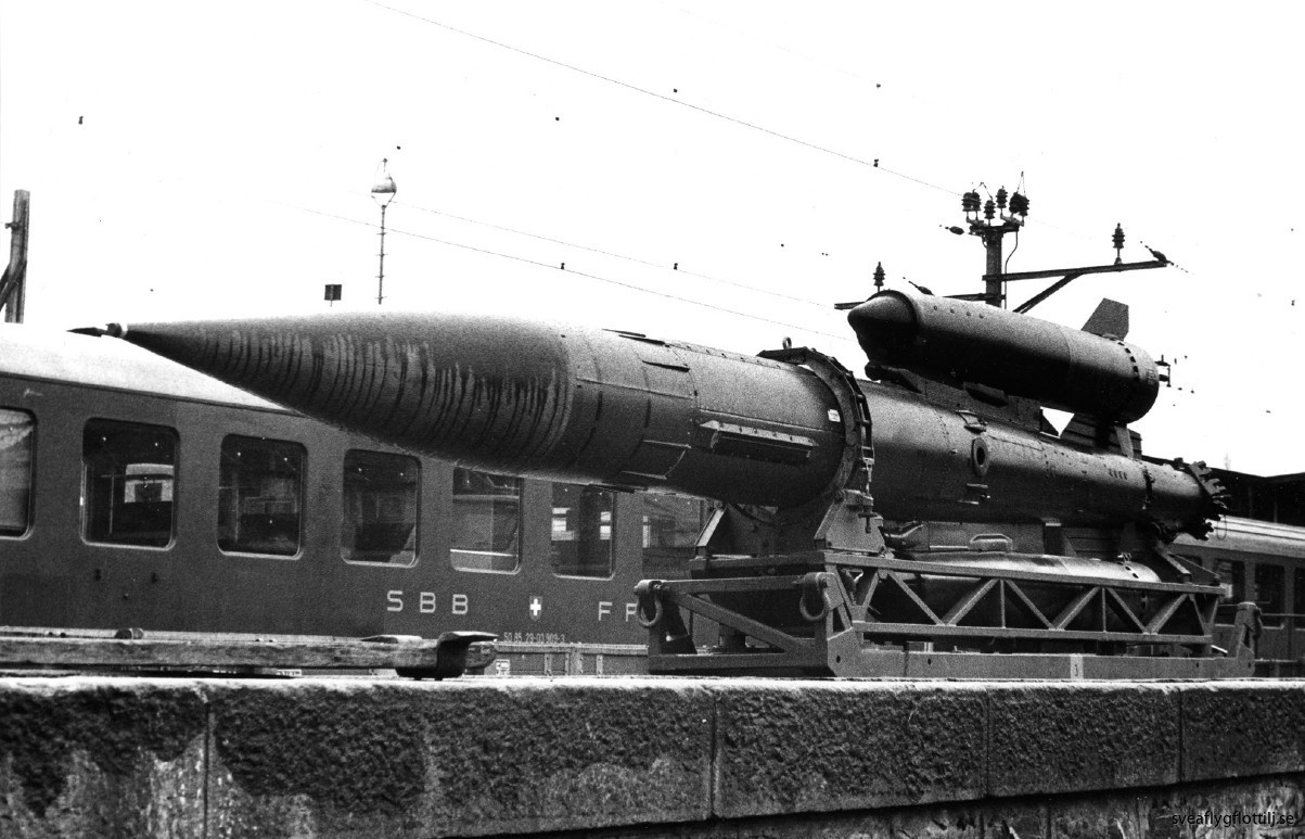 En av robotarna som såldes till Schweiz på en perrongen vid Luzern Banhof. Roboten ligger på robotställ och stativ.