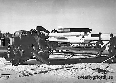Till höger ser vi åter 4756 på punkt C, nu är det F 17 som är på plats och året är 1975. Åke Olsson monterar startrakettändare övervakad av Lars Gröön.