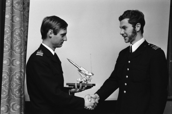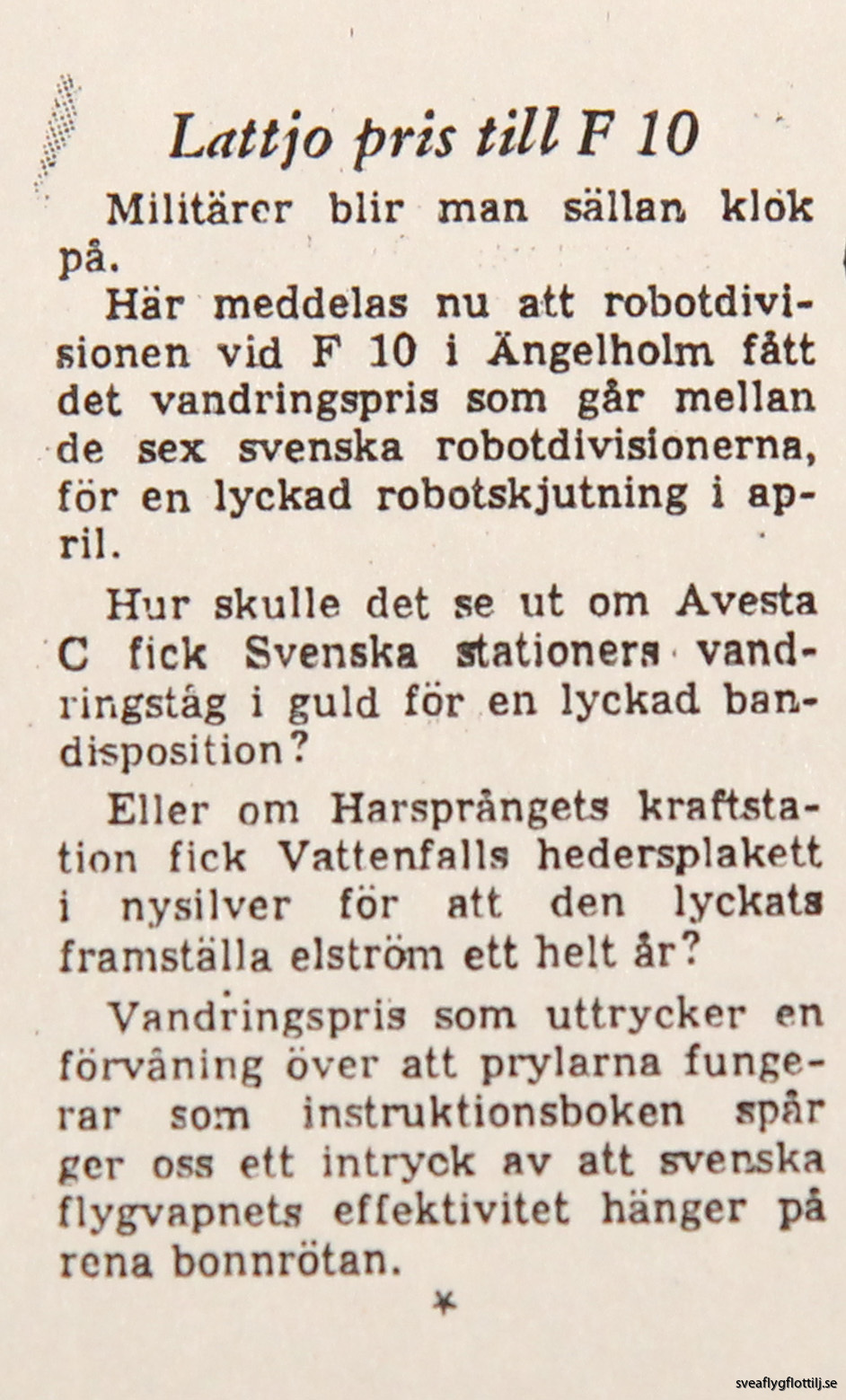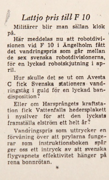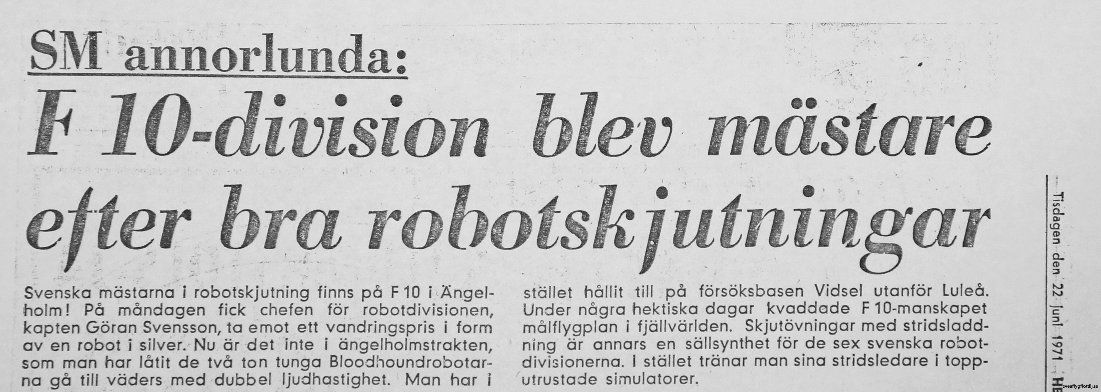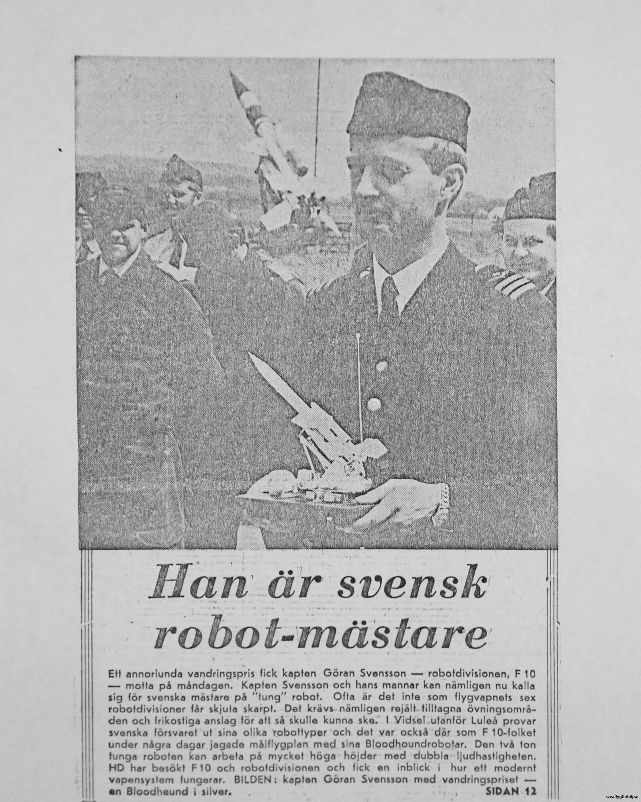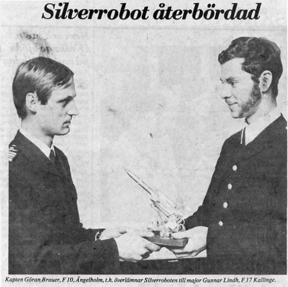 Efter F 17:s kontrollskjutning 1975 publiceras denna bild i någon ej nämnd lokal tidning i Blekinge. I texten berättas att ” I en enkel ceremoni i torsdags överlämnade förre chefen för det nedlagda robotförbandet på F 10 (Göran Brauer) silverroboten till chefen för F 17 robotförband (Gunnar Lindh). Silverroboten ska förvaltas av det förband som senast genomfört en kontrollskjutning”.