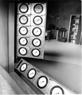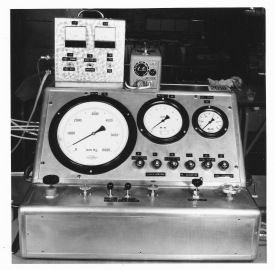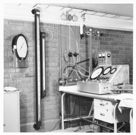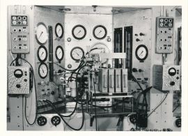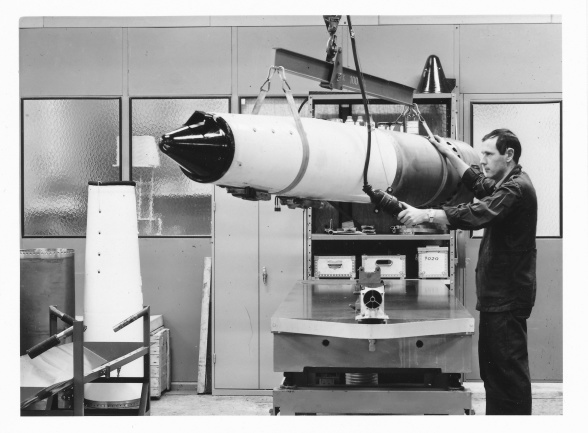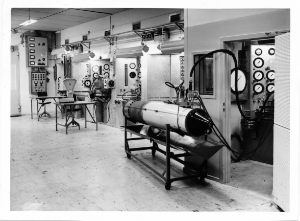 Provplats för startrakettändare i Risinge, här testar Lars Dahlqvist en tändare, den trycktes fast i den svarta lådan, sedan sköt man ut testutrustningen genom väggen så att en ev. explosion skulle ske utanför byggnaden.